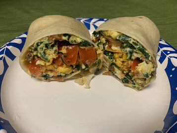 The Popeye: 2 Eggs Scrambled, Bacon, Spinach, Tomato and Provolone in a Wrap $8.50